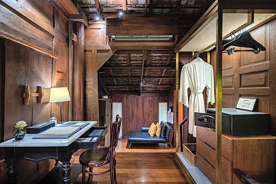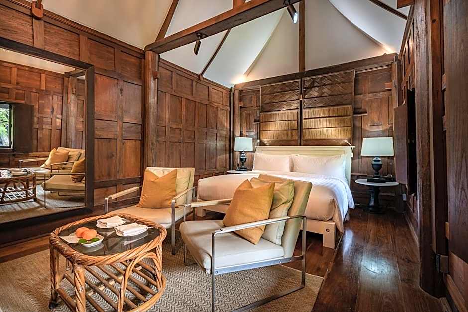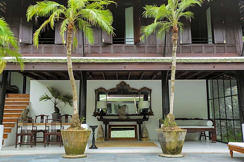This villa features a balcony, dining area and an open-air seating area.